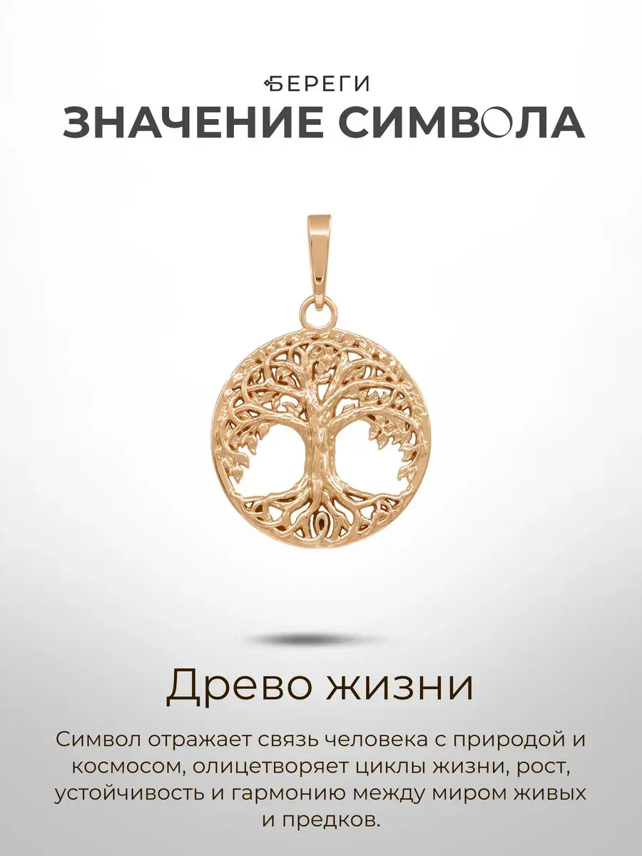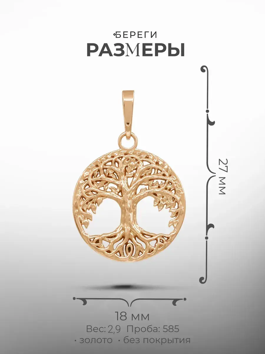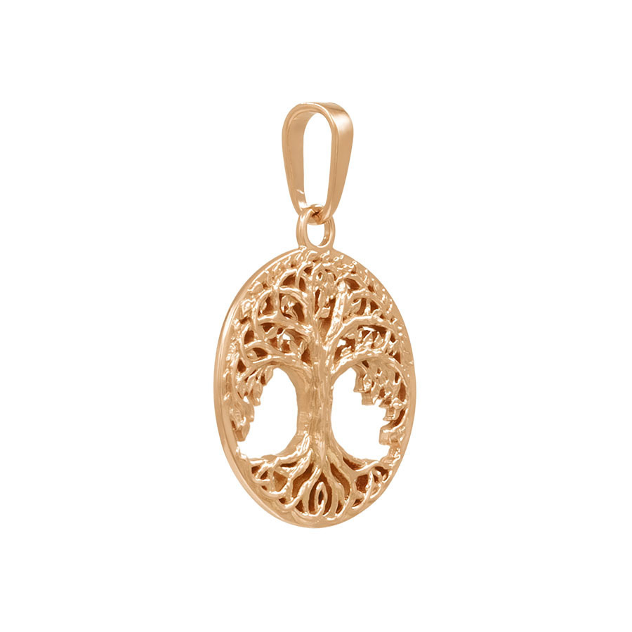 Древо (дерево) жизни - ювелирная подвеска тонкой работы мастера. Выполнена из качественного красного золота 585. Размер 18х2х27 мм, вес около 2,9 гр. Отверстие под шнур у данной подвески 4 мм.