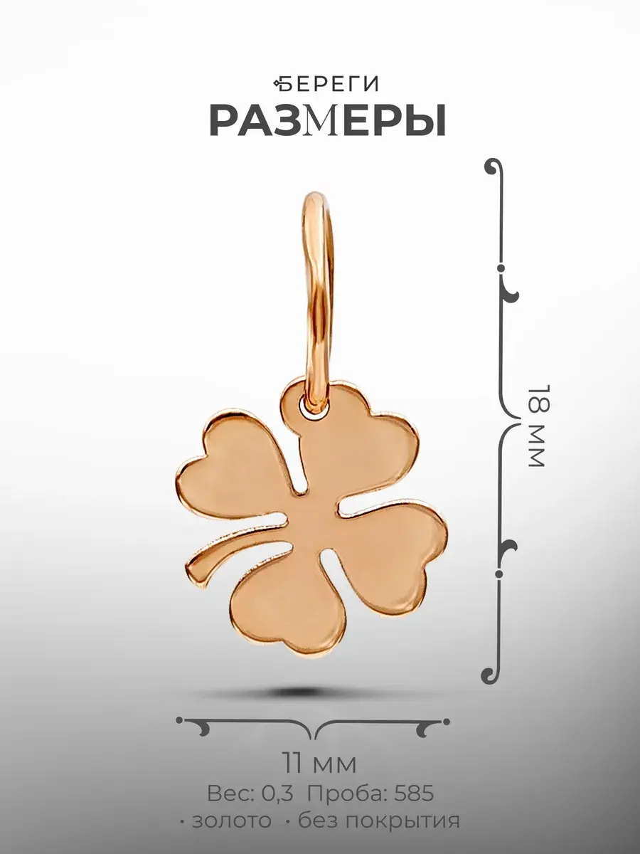 Ювелирная золотая подвеска на шею Клевер малый изготовлена из красного золота 585 пробы. Размер изделия 18х11 мм, ушко под основу до 5 мм, вес около 0,4 г.