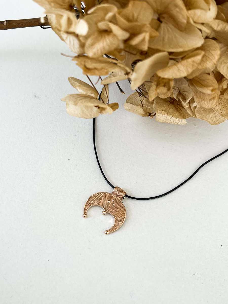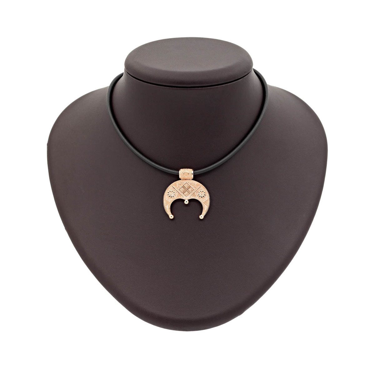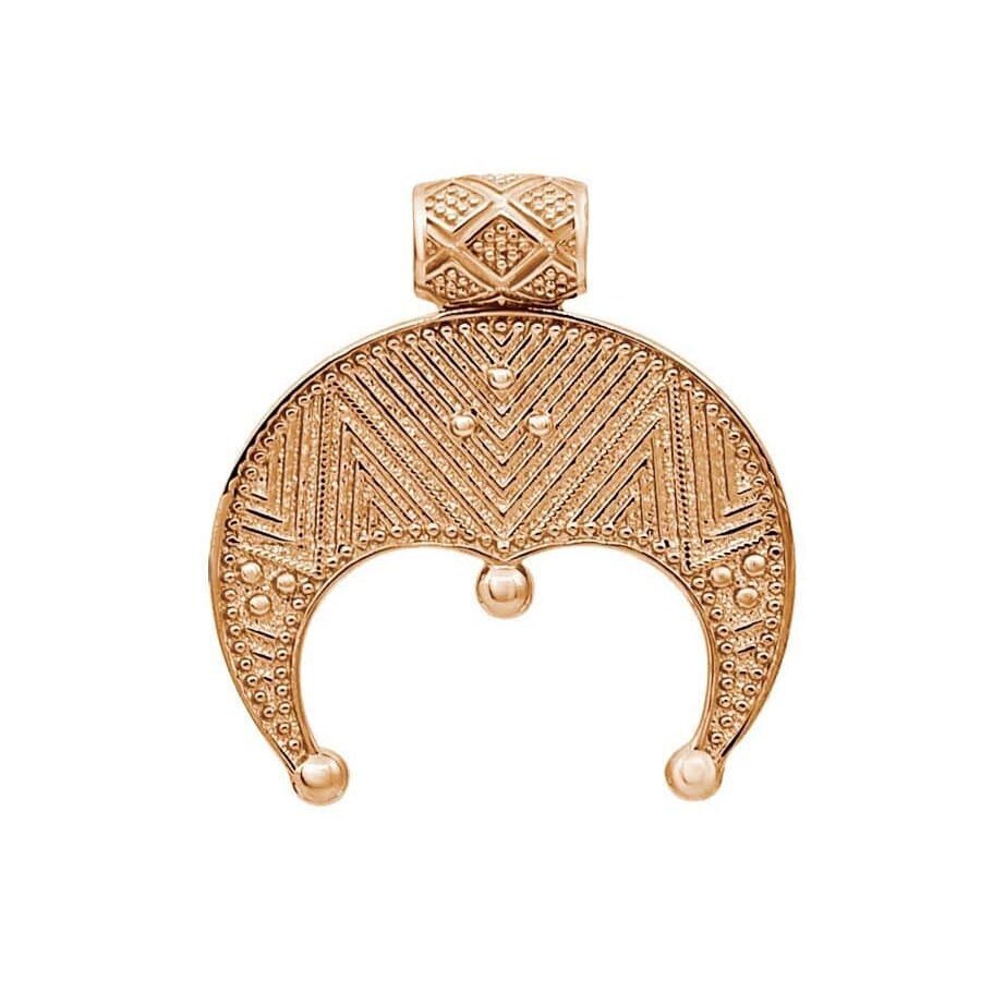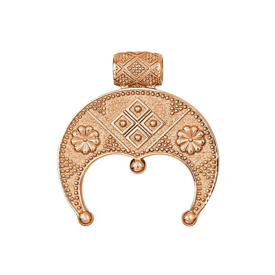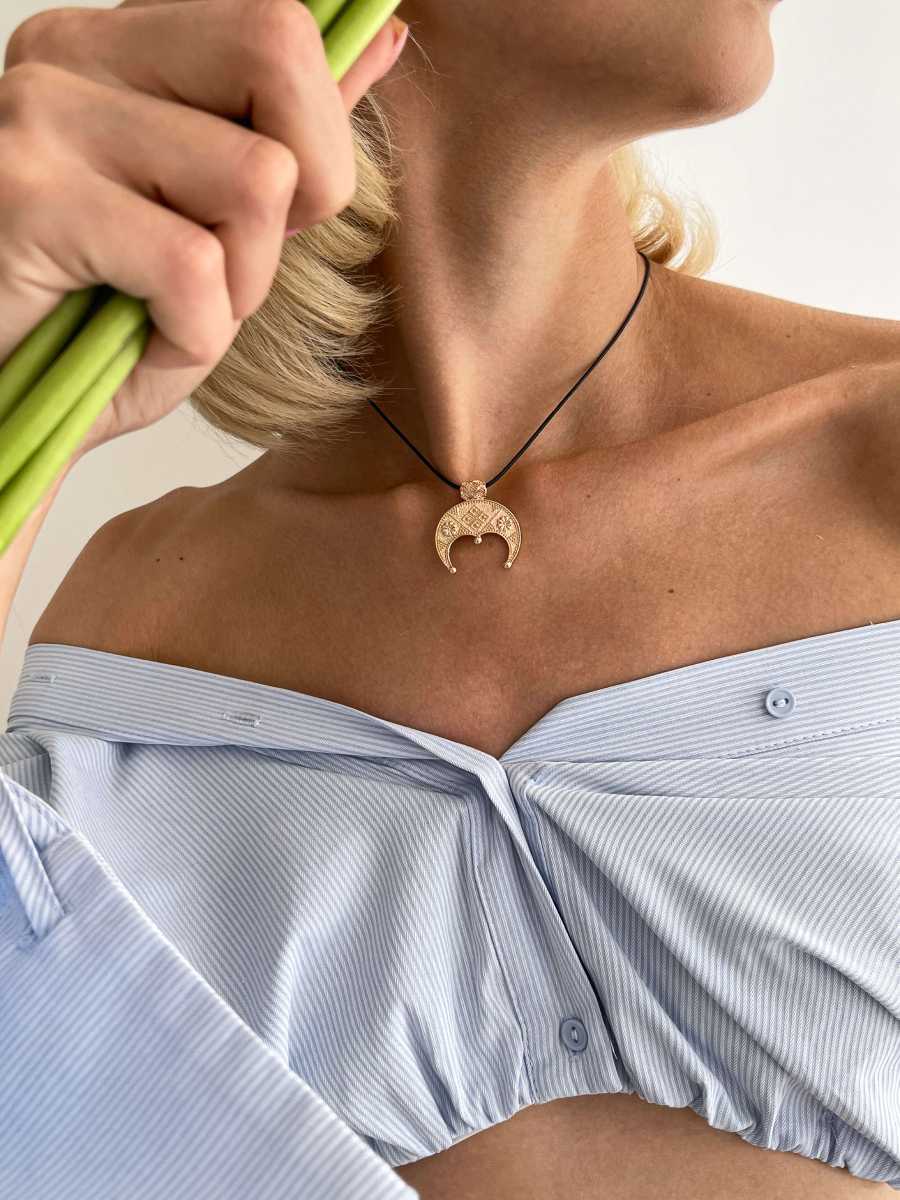 Подвеска в виде лунницы с изображением символа оберега Макошь. Оберег Макошь почитался русскими женщинами за то, что защищал от бед и даровал семейное счастье, гармонию в отношениях, а также благополучие у детей.