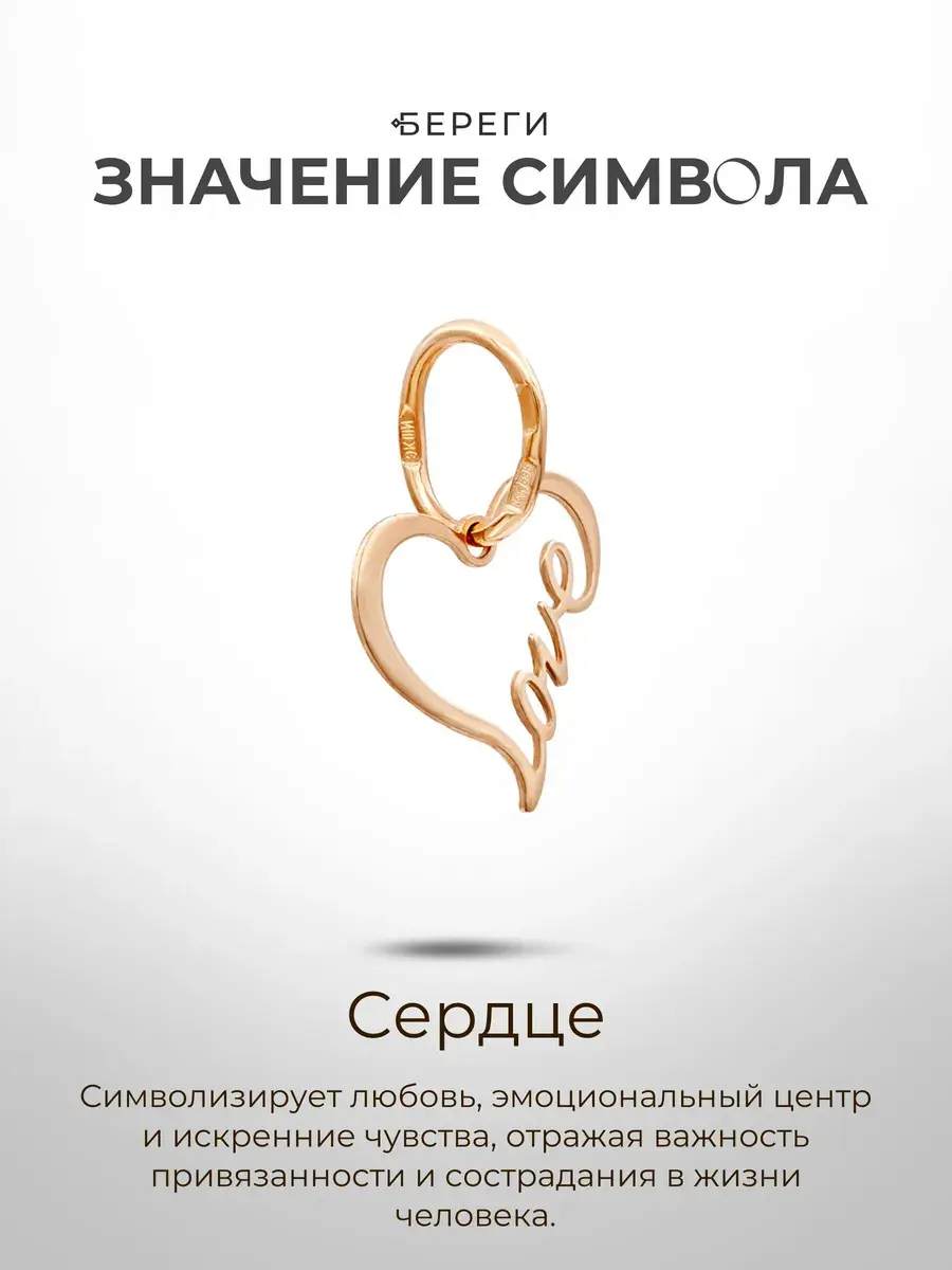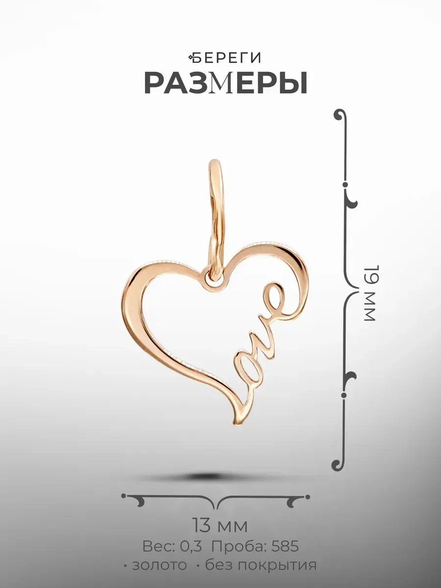 Ювелирная золотая подвеска на шею Сердце Love изготовлена из красного золота 585 пробы. Размер изделия 19х13 мм, ушко под основу до 5 мм, вес около 0,3 г.