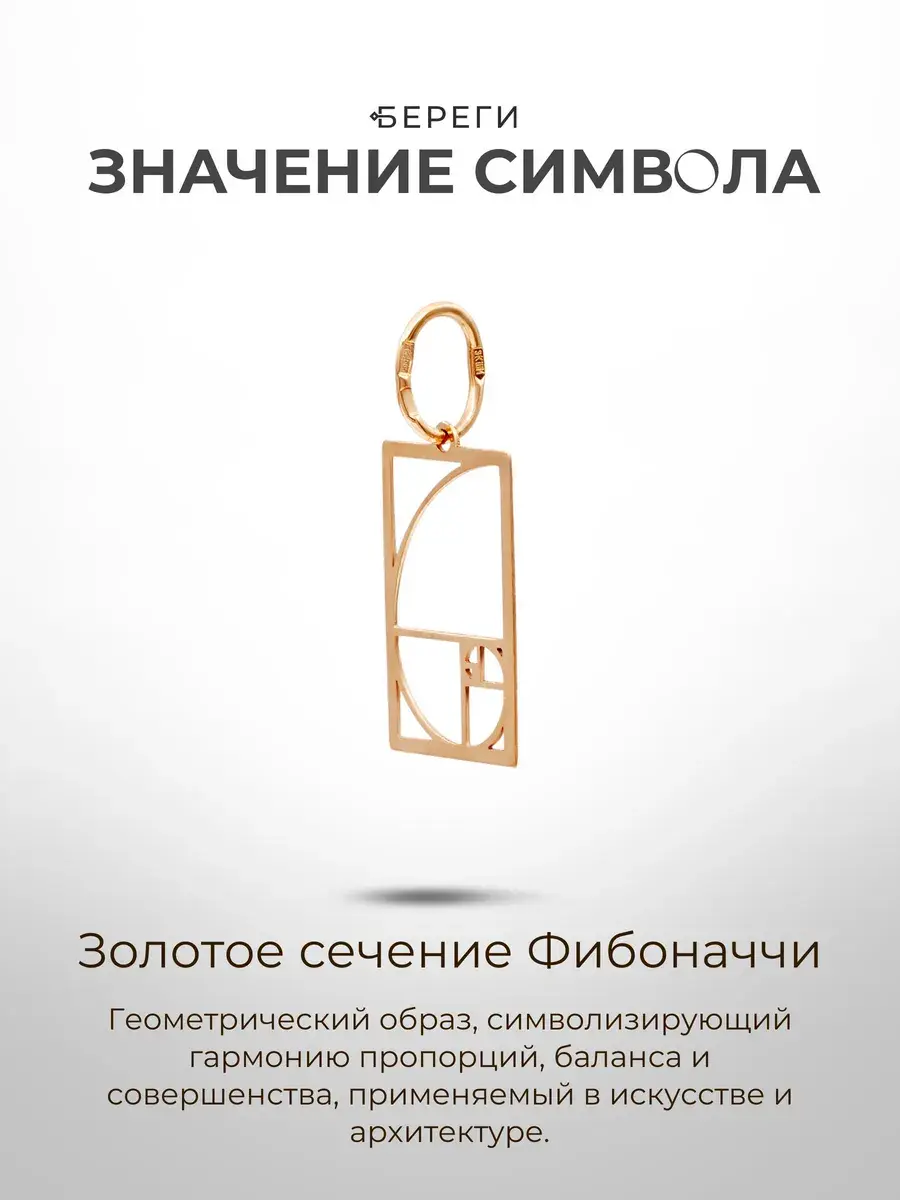 При создании данной модели кулона мы вдохновлялись символом “идеала”, гармонии, идеальных пропорций и безусловной красоты. Известная также как "золотое сечение", математическая пропорция Фибоначчи формирует гармоничный баланс между пропорциями элементов, что наиболее полно отражается в данной модели. Кроме того, символ золотого сечения является не только уникальным и привлекательным элементом дизайна. Его математический смысл также может иметь философский подтекст, в котором заключено гармоничное благополучие и счастье - это сделает ваше украшение не только красивым и элегантным, но и наполненным глубоким смыслом. Поэтому такое ювелирное украшение будет прекрасным оберегом, дарует баланс и гармонию, отведёт негатив и поможет сконцентрироваться на главных вещах в Вашей жизни.